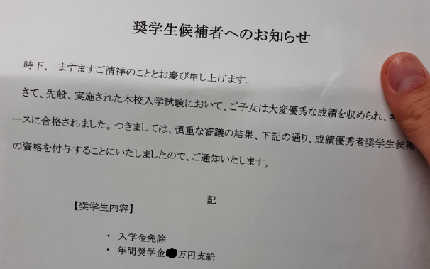 メルマガで書かれていた通りの方法で、子どもは特別奨学生(特待生)を取ることができました。